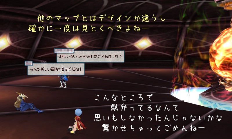 ココだってある程度の広さを持った閉空間です。 人通りがないことを逆手にとったらこうして落ち着いてお話するのには向いていると思います。 そういえば先日見かけたストリーミング放送では、ここにキャラを置いて画面を映したまま、でもゲーム内では何もせずただ MoE に関した雑談だけをやってましたっけ。 ゲーム内で完結するか外でコミュニケーションを取るかの違いはありますけど、用途としては同じですね。