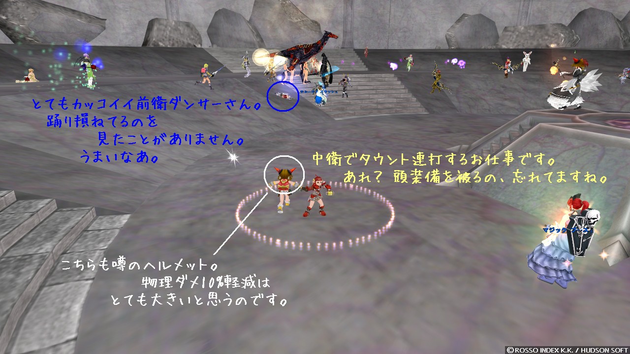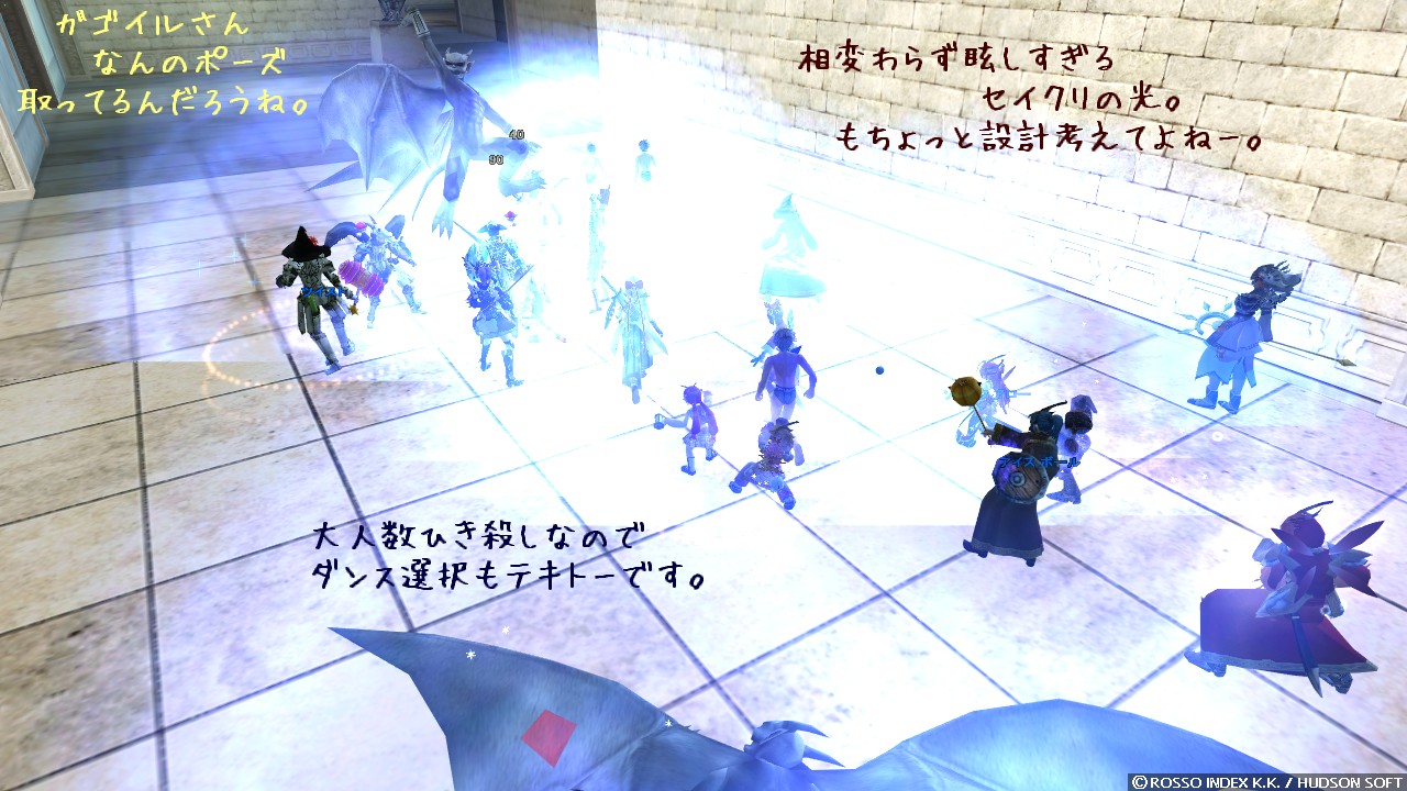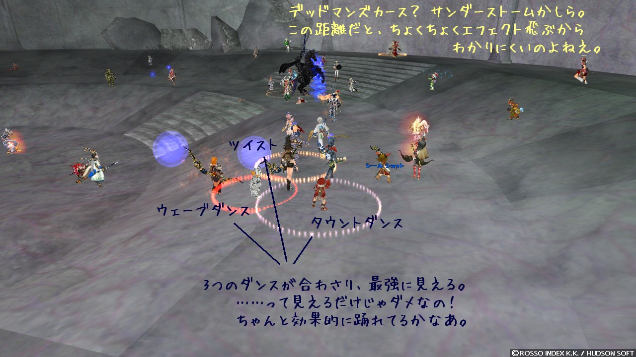 立ち位置に関してはまだまだみたいです。 弓や銃、魔法の距離で踊り続けるのだけは、まあ出来ているみたいですけど、視線の問題があるから高低なんかも考えられるようになりたいですね。 ただ、動くタイミングは難しそう。 集まってきているのをわざと散らすことになっちゃいますものね。 ダンスに say マクロ仕込めばまた違うんでしょうけど、あまりやりたくないんですよねえ。 悩みどころです。