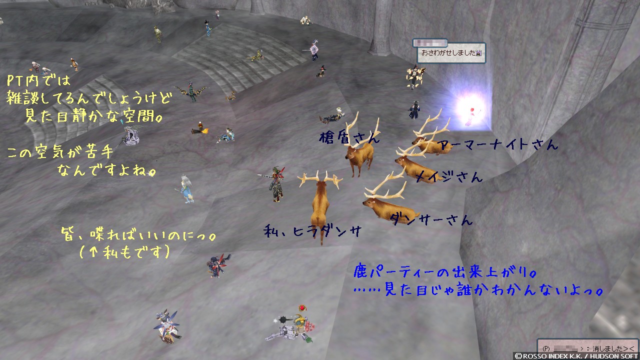 儀式の間ではいつもの人がヘビ串を売っていましたね。 また買わせてもらってもよかったんですけど、ちょこっと対抗意識が湧いてきました。 鹿センベイを取り出して PT 皆に配布です。 なんていうかこの一画だけ空気が違ってきますね。 見た目が変わるアイテムは揃えて使うと目立つので楽しいです。