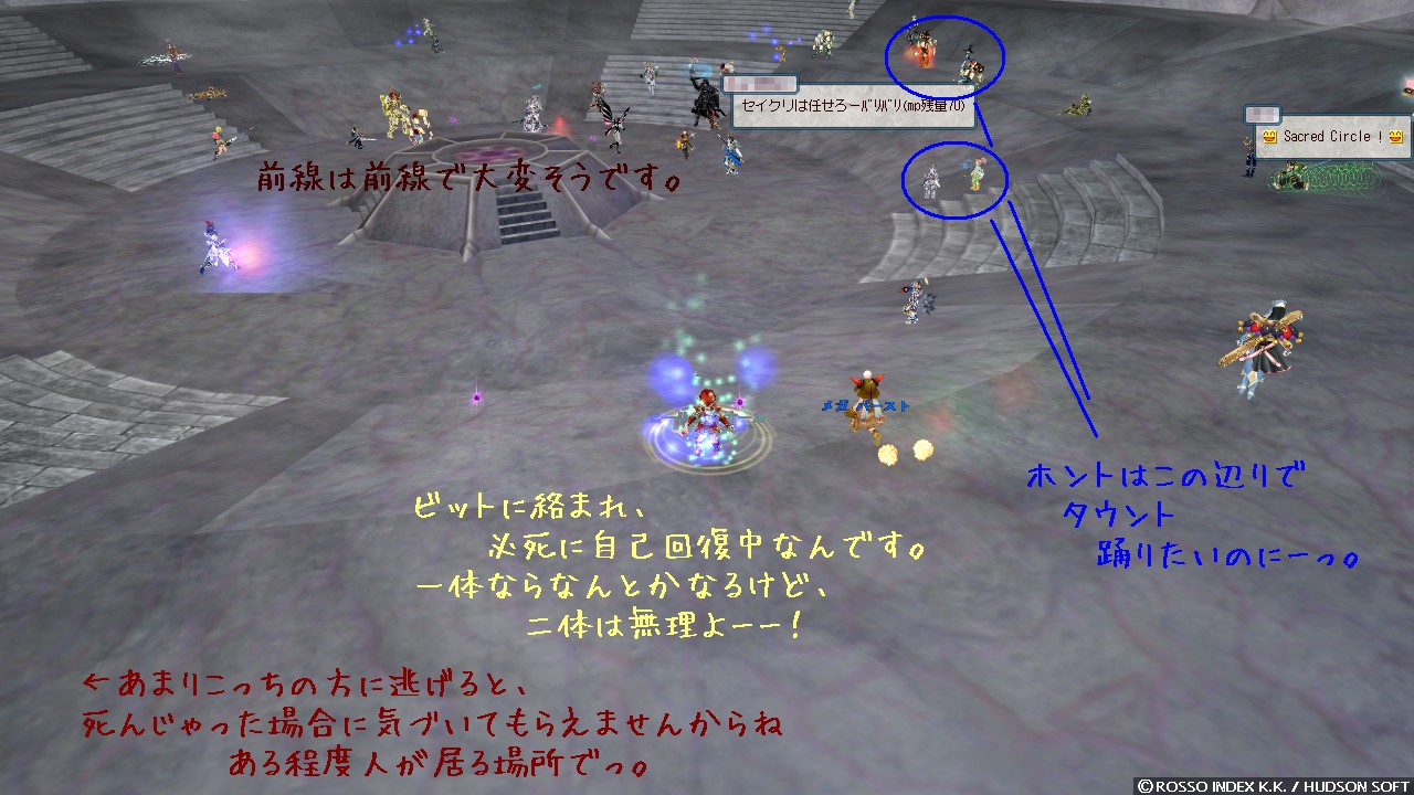 一体くらいなら何とでもなるんですけど、複数絡んできてるのでもう自己回復に必死ですよ。 走り回りながら付いてきている数を把握しつつ、人の邪魔にならないように動き回ってみます。 他人に擦り付けるのは嫌ですし、かといって一人で耐え続けるのは無理だしで、このジレンマは厳しいですね。