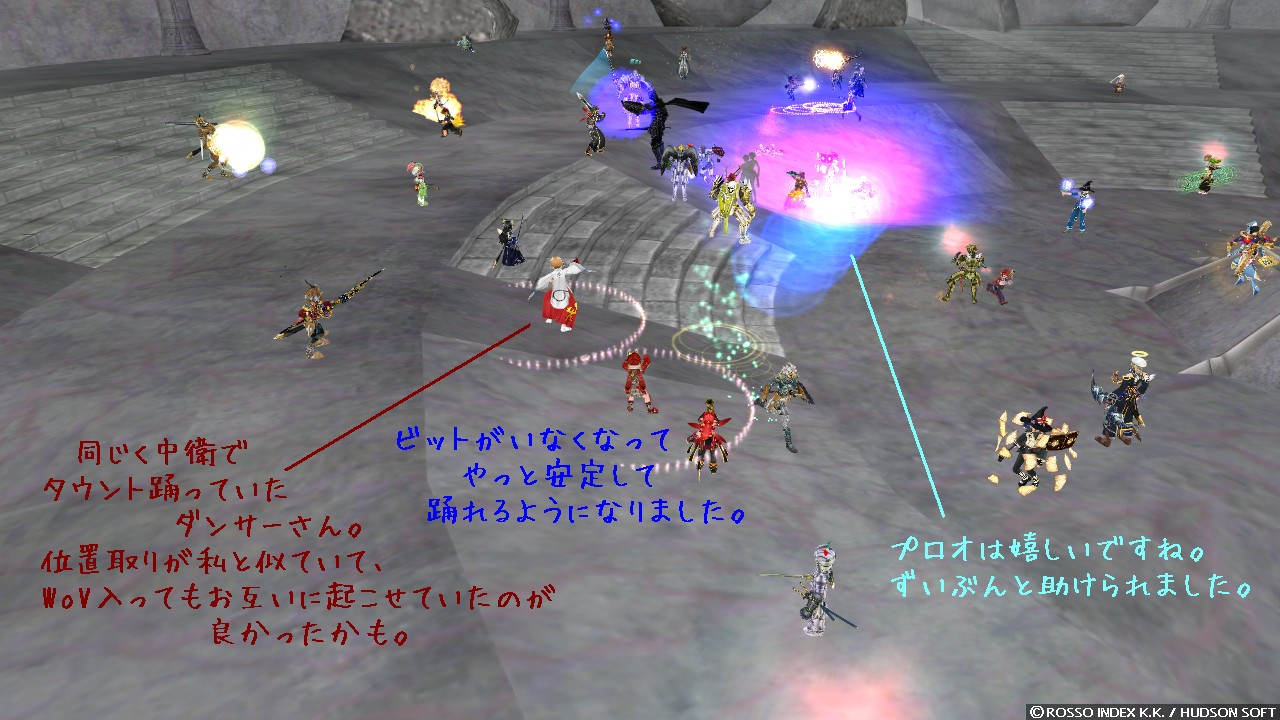 位置取りは他人の後ろに付けているだけで済む、魔法を食らわないから HP が減らない、ST の心配をしなくていい、自分も起こしてもらえるから WoV で固まったままザハに近づかれることもない。 うーん、これはアレですね。 本当に、何も考えずに、踊り続けてていいってことですねっ。