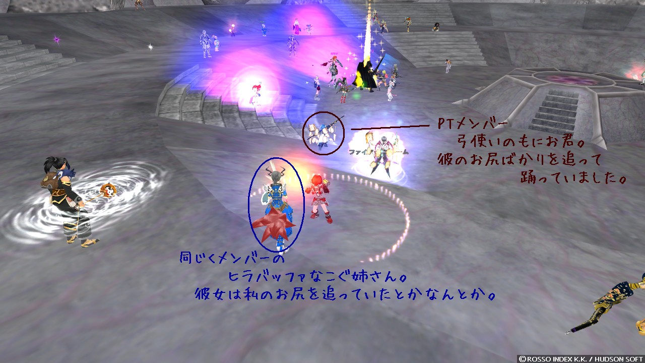 さすがにもう迷子にはならないので、最後尾でのバンザイには慣れたものです。 これくらいの人数だと倒して進むほうの手伝いは多分必要ありません。だから皆の後ろへついていくだけです。 気楽に踊り続けますよー。 ええサボってるとも言いますけどねっ。