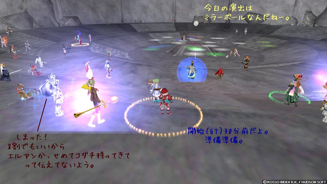 開始前に近くに居る白ネームさんを拾って即席フル PT にしてみます。 何も考えず適当に拾ったため回復持ちが 4 人もとか、なんだか偏った編成になった気がしないでもないですけど、気にしちゃだめですよね。 本戦中は予想通り怒涛の GH ラッシュになりましたけどっ。