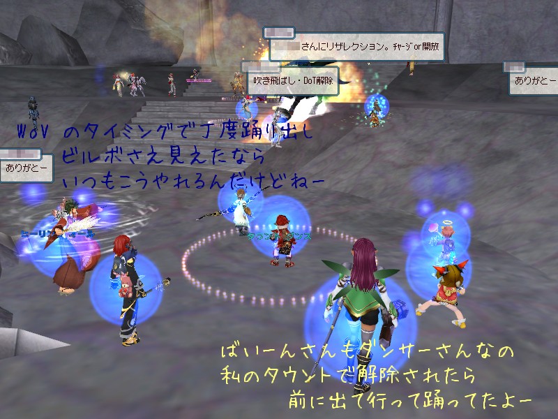 ところで、センテンスが入った瞬間には大抵タウント中だったりします。 踊り終えてからもちろんシスエモ歌うわけなんですが、効果が出る(PT メンバーから見て、効果が来る)までに結構な時間ができてしまうわけで――。 一応タイムリミットの 20 秒までには時間があるけど、皆リムポ飲んだ後なんじゃないのかしら。 そんなことを思いながらも PT チャットを「シスエモ詠唱」で埋めてました。 アレで良かったのかなあ。
