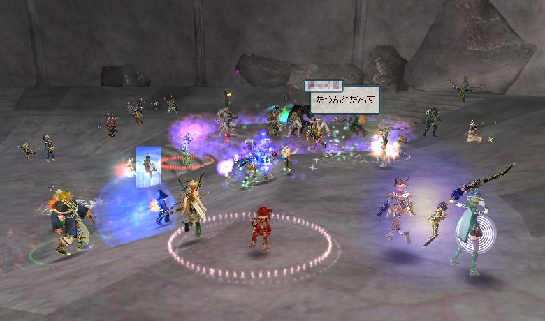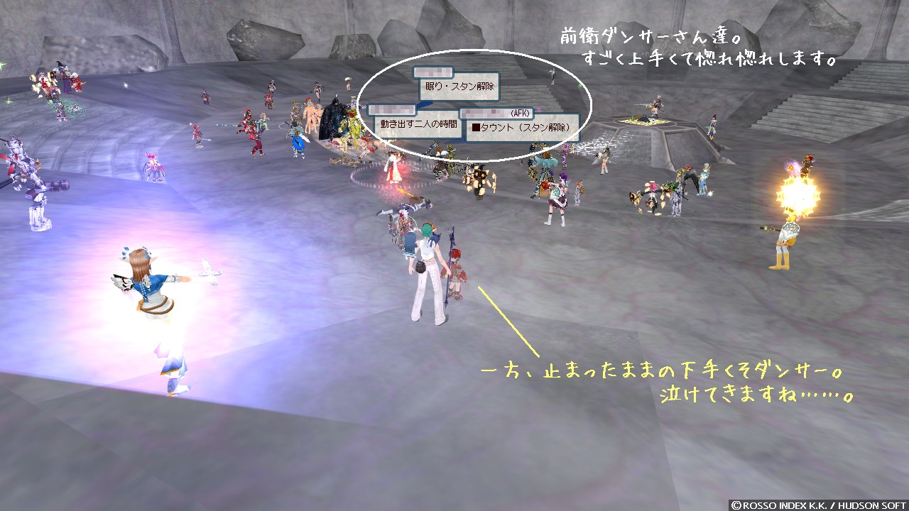 ダンス位置の見極めはまだまだ課題のようです。 一人でも多くタウントの範囲内にというのは勿論やってますが、ヒーラーさんを追いかけるのも大事ですよね。 誰がどこで何しているか、までは全然見えてないのです。 タウント踊っている数秒は暇になるんだし、場を(特に前線を)上手に支えてるキーマンを探さないとっ。