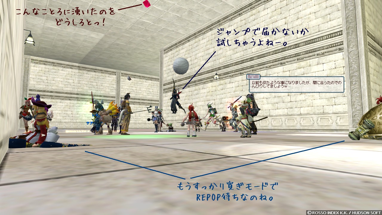 こうなってしまったら de-repop を待つしかないわけで、皆さんのんびりと湧きを待ちです。 かなりの時間ロスになりますけど、D は余裕を持っての 12 時出発だから大丈夫でしょうね。(実際、転送時間の 1 時ちょうどに台座の間到着でした)
