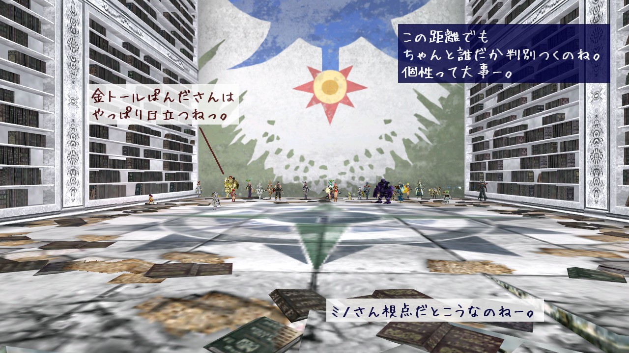 予想していた通り、ミノさんは Lv140 と手ごろな強さですね。 参加者が 30 人弱だったかしら、そこそこ居るからあっさり終わるでしょう。 私はヒラとしてでもダンサとしてでも、後ろの方で動くことになるため、この程度の強さだと多少気を抜いていても危険になることはそうそうありません。 前線が壊滅する、なんてこともないでしょうし、遊んでていいかしら。