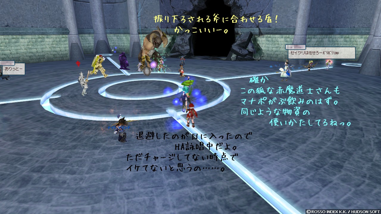 今日は前衛アタッカーさんが結構な数いまして、おかげでタゲが移りがちだったのかな。 ウチのジャスタンさんも盾を合わせにくそうにしていました。 ただ、抜けてもそれ程怖くないので、落ち着いてヒールと定期的にリバと。 ごっそり HP が減った人が見えたら、タゲを取ってチャージしてある HA を開放……って、減ったの見てから慌ててタゲ取ってるようではダメなんですよ。 ミノのタゲくらい把握しておかないといけないですね。