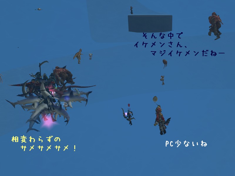 今日見えていたサメは 10 体とちょっと。 一人で 3 体まで呼べるとかって話ですから、今日はサモンバディを覚えてる海戦士さんが 4 人参戦してたってことなんでしょうか。 これから習得する人も居るでしょうし、もっとサメが増えるんでしょうね。 大量のサメに食われ続ける少女という絵づらも、うーん?