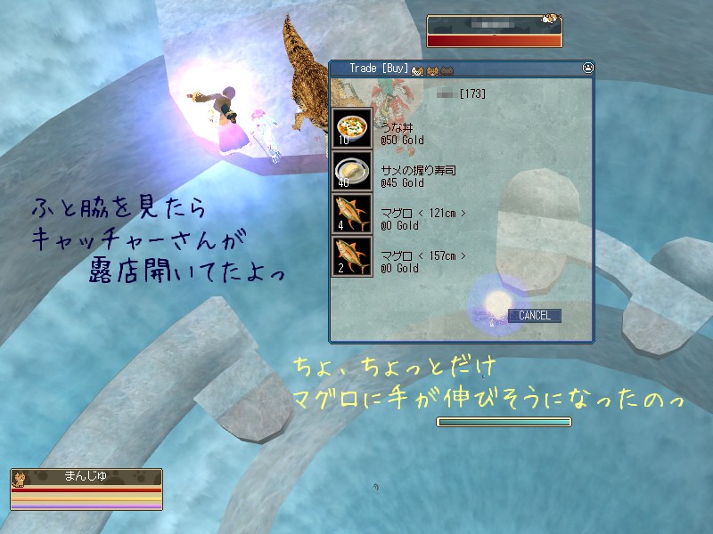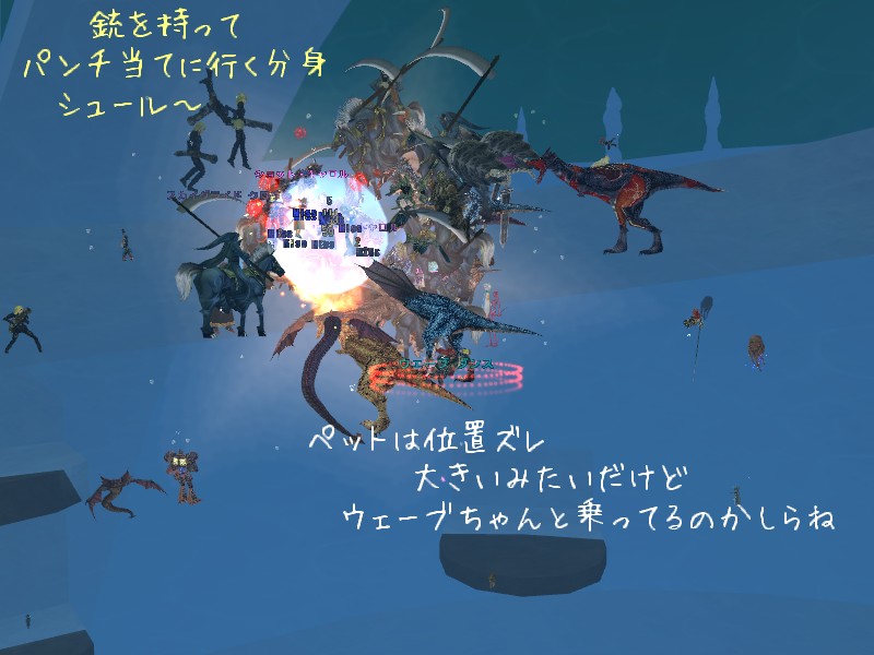 始まってしまったものは仕方がないです。 /tar でタゲとって PT に誘えばよかったと思いながら、とりあえずいつものように動き始めると、やっと見つけましたよ。 ワニの姿で弓を引いていました。 名前を消しているのでターゲット取るまで全然気づかなかったのです。 水着を着てプレートつけたモニさんを探し出そうとしてたんですもの、いくら探しても見つからないわけですよね。