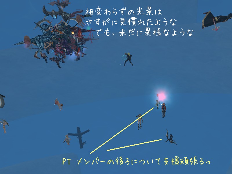 本日も PT は二人だけです。 いつもは手持ち無沙汰だからと、あっちこっち動いたりもするんですけど、今日はメンバーを見失わないようにを心がけてみます。 となると必然的に PT 外にはあまり手を出さなくなりますね。 一人だけへの回復役は、どうしてもひまーなタイミングとかできちゃいますけど、ぐっと我慢我慢ですよ。 近場の見える範囲にだけ回復飛ばしてっと。