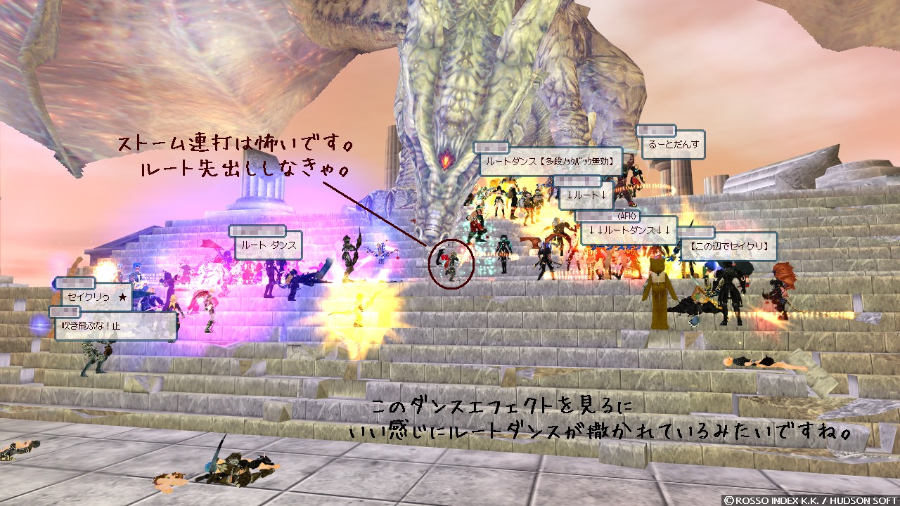 二回目のストーム時間も、吹き飛ばされさえしなければ随分と余裕がある様子ですね。 ダンサーさんたちがしっかり先出しルートしているので戦線はやっと落ち着いてきました。 この状況を見ると、全体にバラけずに一箇所に固まってセイクリ・ダンスを上手に乗せたほうが、危なげなく戦いを進められそうに思うんですけど、最初の人数だと左右どっちかに固まるのは無理なんでしょうか。