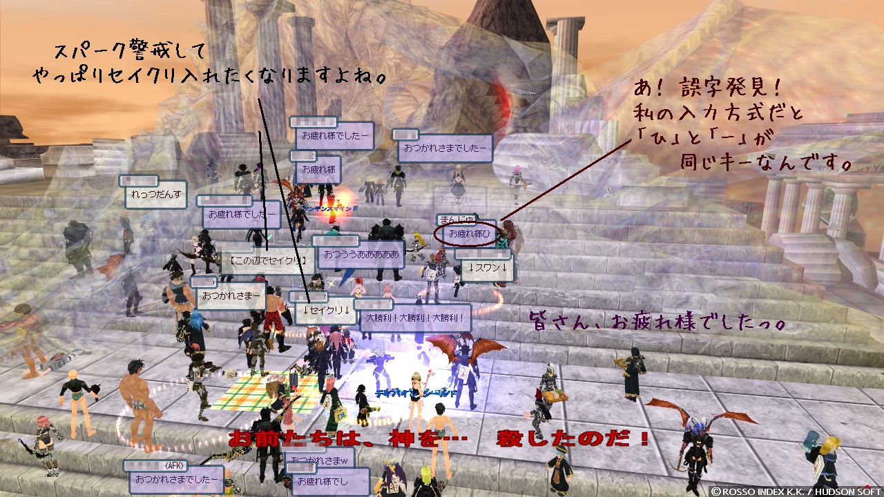 回復しなくちゃいけないのに出来ないから、涙目になりながらマナポと GH 連打ですよ。 必死すぎて気づいていませんでしたけど、会話のログを見ると「踊りなんていいから、さっさと回復してくれ(もちろん脚色してあります!)」って言われてるしー。 うー、ヒラとして入ったはずなのにちょっとした回復も飛ばせなくてゴメンナサイですよ……。 なんかログ見返してて惨めな気分になってきました。 幸いにもメンバーはそこそこ硬く、二回に一回くらいしか飛ばせない回復でもなんとか持ちこたえてくれていましたけどね。