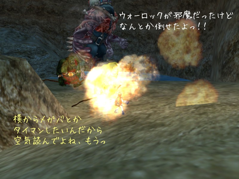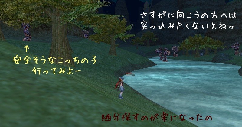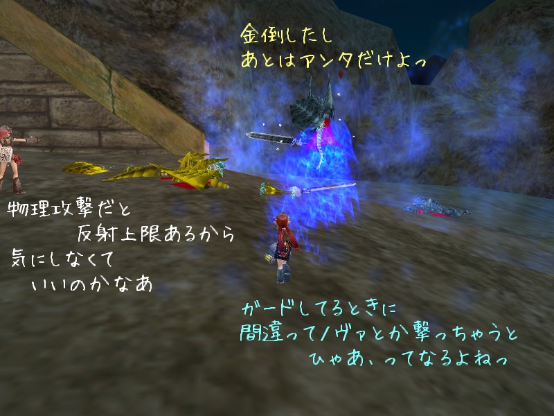 谷で知り合った PC も何人か居ますが、気がつくと見かけなくなっています。 顔見知りになって喋ってても、一緒に狩りに行こうかって話にはならないですものね。 大抵は一人で狩れちゃいますし、危ない場所では 1 ミス犯して死んじゃうだけで面倒なことになりますし……。 リザできない QoA 仕様は、やっぱり PT 戦には不向きなのかしら。