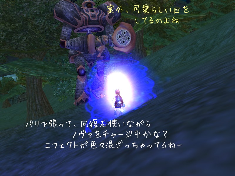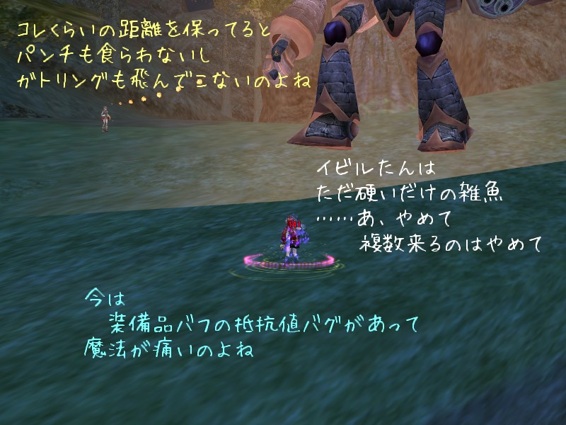 まずは夜に切り替わる前に場所の整理からです。 魔法ギガスが 4 体かしら、結構な数徘徊しているので、全部拾って離れた場所に捨てに行きます。 ここはどっちに向かってもイビルノアゴーレムが居るので、思ったように動かせなくてヤキモキしますね。 できる限りバリアを張って魔法は防いでますけど、ちょくちょくコーリングで戻されて(「pop 地点への」コーリングの仕様はおかしいと思うんです!)また引っ張りなおしての繰り返し。 複数リンクするし勘弁して欲しかったですよっ。