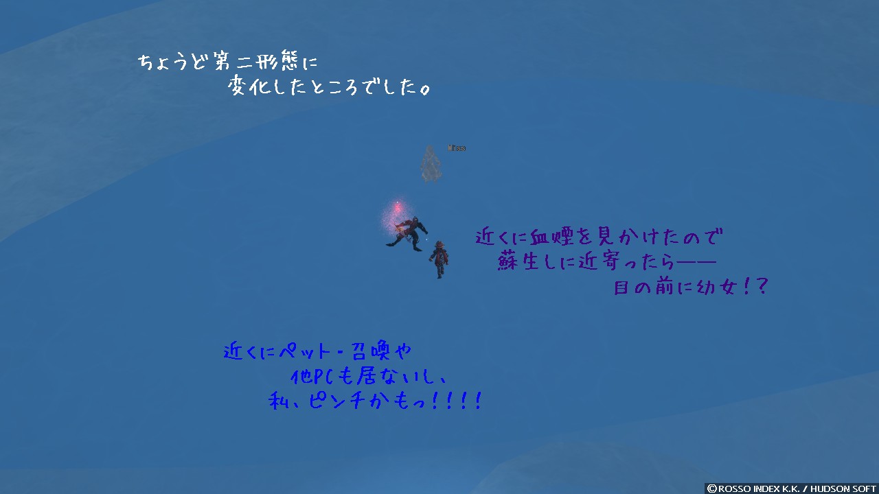 引きずり込んだ後は特に問題なく第一形態終了。 その終了の直前にですね、血煙を見たのでリザを掛けに行こうとしてたんです。 もう少しで届くってタイミングで画面が真っ白になったんですね。