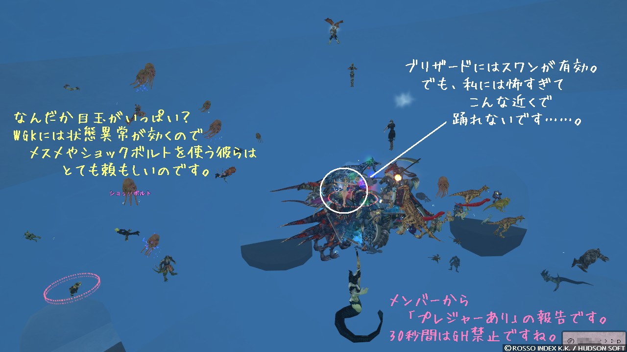 降ってくる WGK、群がり始める PC やペット達、下方からはキャッチャーさんが引き下ろしに。 あれ? 引き下ろしに……、ひき……おろし、に? あの、落ちてこないんですけど。 なんだか今日はやたら浮く幼女です。 上空の届かない位置まで何度も戻っていったりとか、うーん。 どうもノックバックが悪さをしていたみたいですね。 逆拒絶かっ
