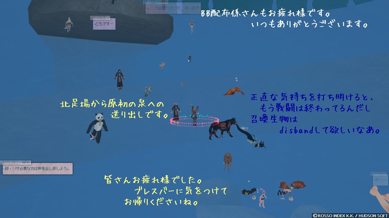 第二戦へはいつもギリギリに in するので時の間に入ってからふと忘れ物がないか不安になったりします。 インベントリと手元のメモとを見比べたり装備の外し忘れがないかを確認していると、なにやら隣が騒がしい様子。 目をやると……パンダの着ぐるみが無数のヘビに囲まれてる?!