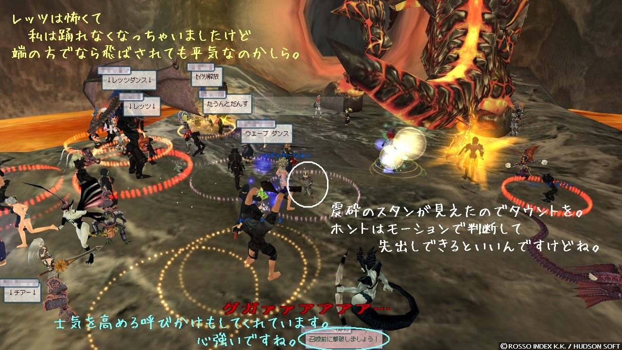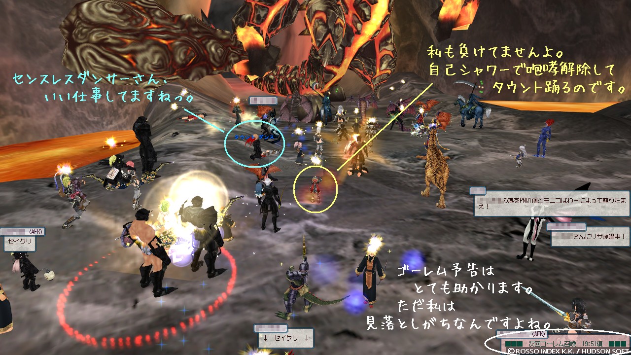 最初は意識して西側でセイクリ撒いてましたけど、回復は過剰気味のようですね。 人が集まってるからそれだけヒーラーさんも多いってことなんでしょう。 ダンスに切り替えようかと逡巡した後、やっぱりいつも通り回復が薄そうな地帯へ出かけることにしました。 ただあまりにど真ん中に陣取らずに、いざというとき逃げ込みやすいように気持ち西か東で。