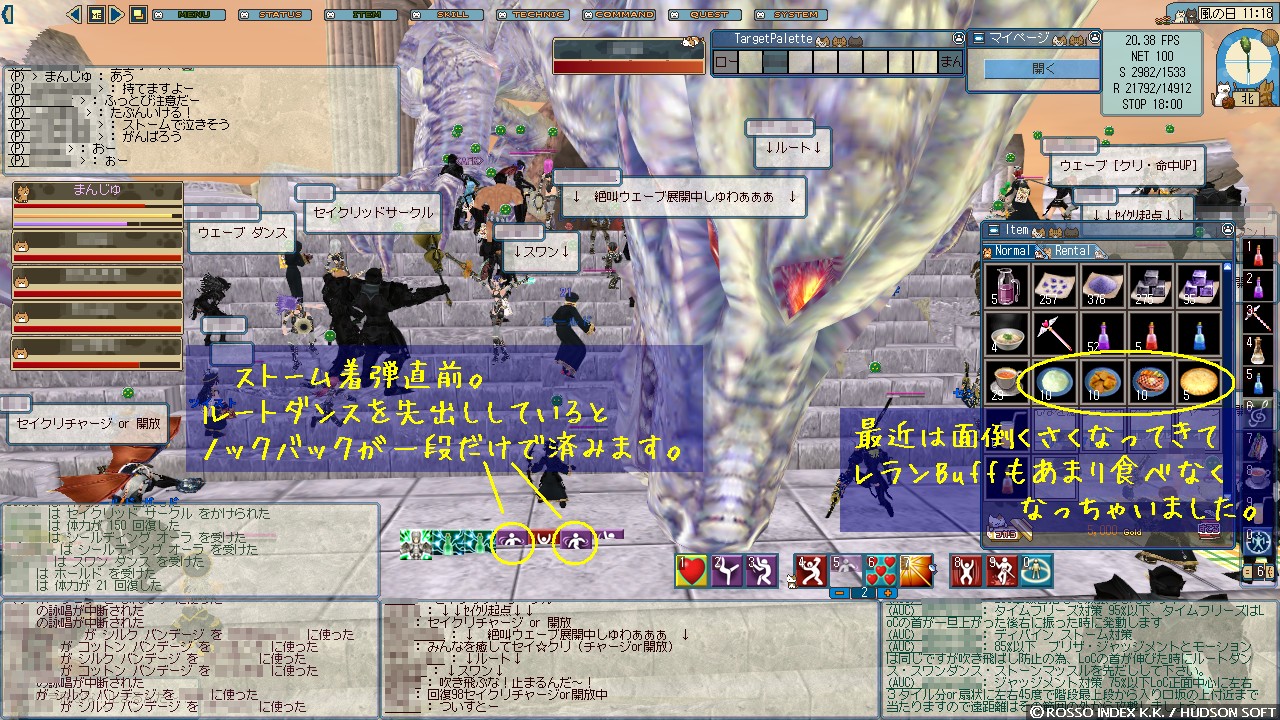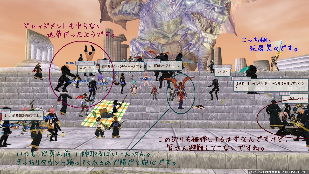 全体でも左に布陣する格好になっていて、左側はセイクリダンスとかなり厚かったですね。 対する右側は後方で頑張り続けている集団はいましたが、前のほうは死屍累々でした。 一応警告アナウンスもでていましたけど、ダンスやセイクリの say マクロで流れちゃうんですよね……。 私も面倒くさがってそのままにしちゃってますけど、shout や AUC は窓を分けたほうが便利だと思いますよー。