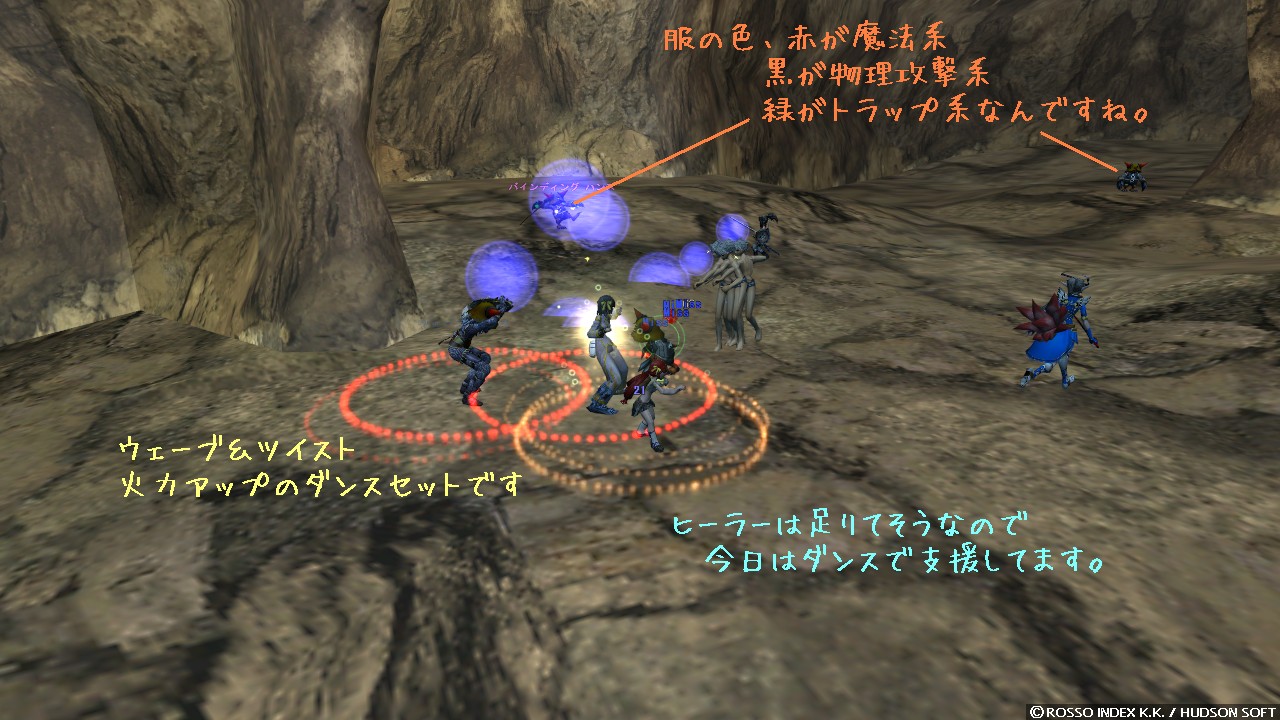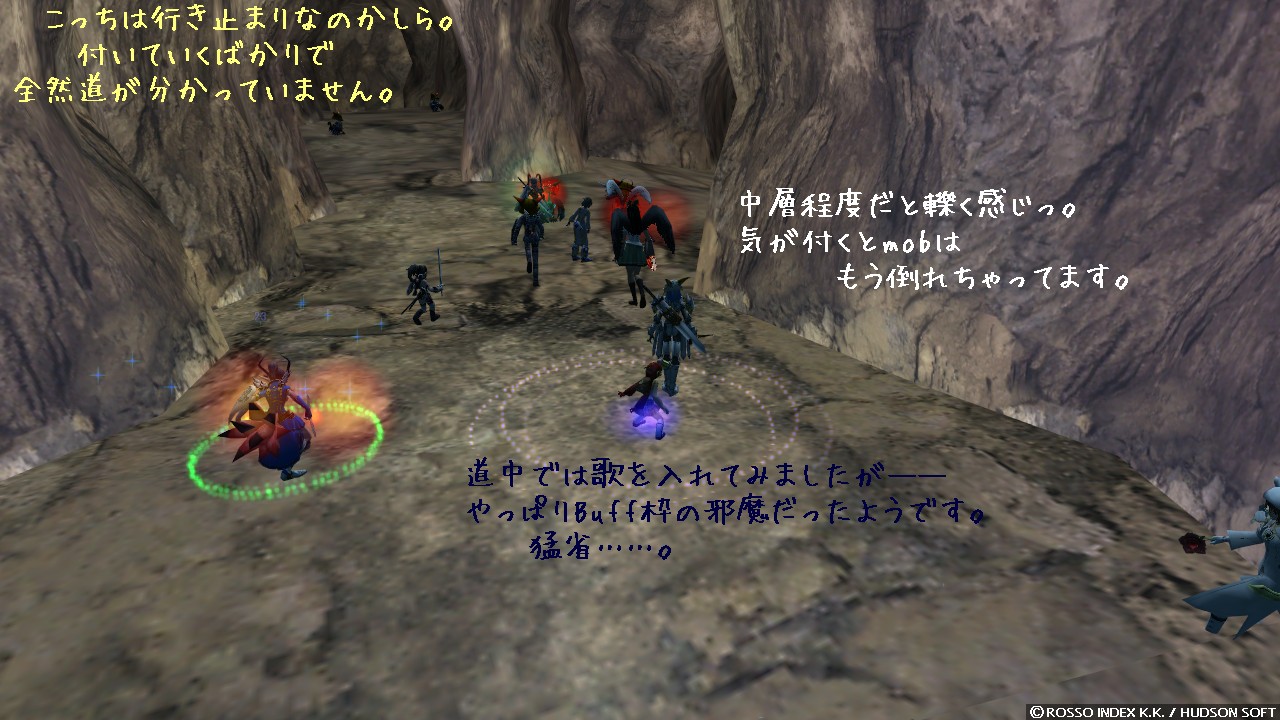 移動中にも何かできないかと、抵抗や AC up を見込んで歌で支援もしてみました。 ええ、やっぱり buff 枠の邪魔だと叱られちゃいましたけどねっ! 16 という枠数は多いようでいて、実際すぐに溢れかえっちゃうんですよね。 ダンスに音楽と、私の出来る支援は全部 buff を使うものなので、張り切りすぎると逆に迷惑になるのが難点です。 上手に取捨選択したいものですね。