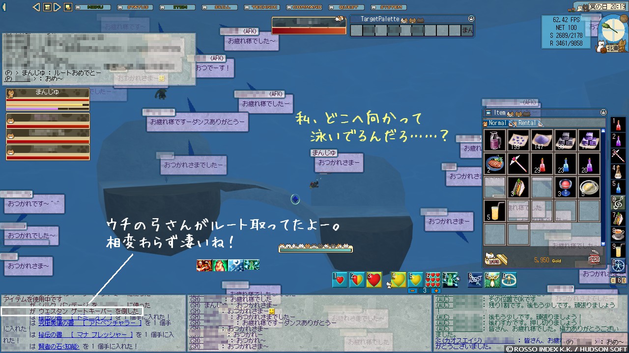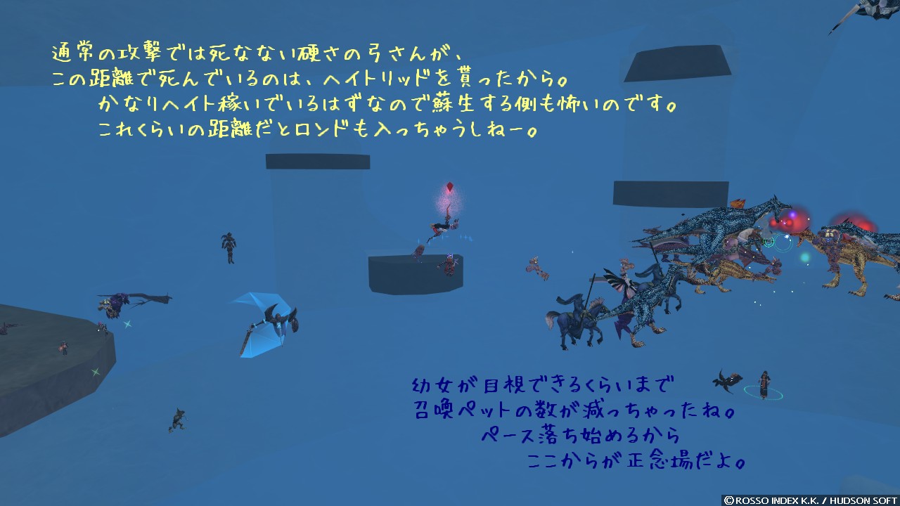 も一人のダンサーさんは水泳がないらしく、足場で支援なのかな、結局前線には弓 1、ヒラ 2 のようですね。 ヒラさんは強化魔熟持ちで、さらにプレイヤースキルも私よりよっぽど優秀です。 これは……私はフラフラ遊んでいていいのかしら。 一人のアタッカーにヒラが二人(一人はヘボですがっ)付いていても、回復過剰で勿体無いですもの。