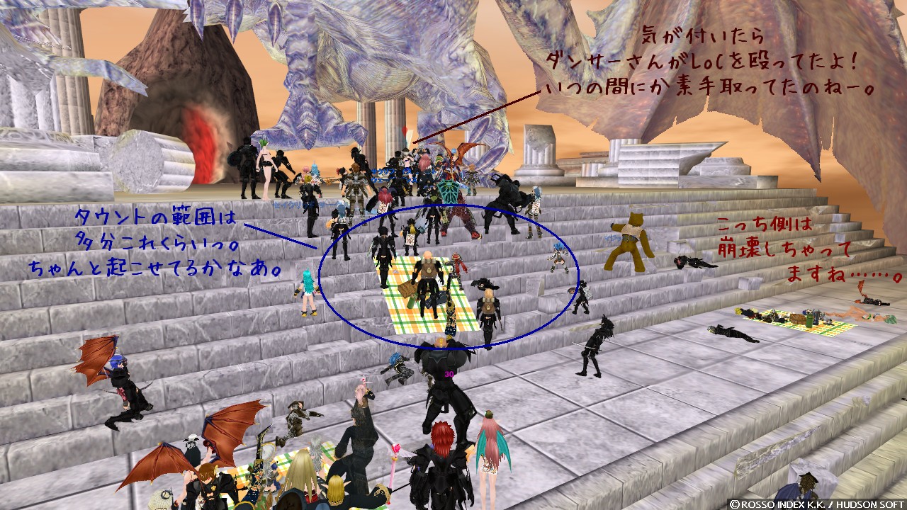 でも、そんな攻撃でもちゃんと起こしてもらえてるのは、回避してタウント踊ってくれてるダンサーさんが居るってことですね。 先読みして(もしくは「こんなこともあろうかと」)センスレスだとは思いますが、その働きにはホント頭が上がりません。 そういう方が居るから戦線を維持できてるですよね。 感謝感謝ですよ。