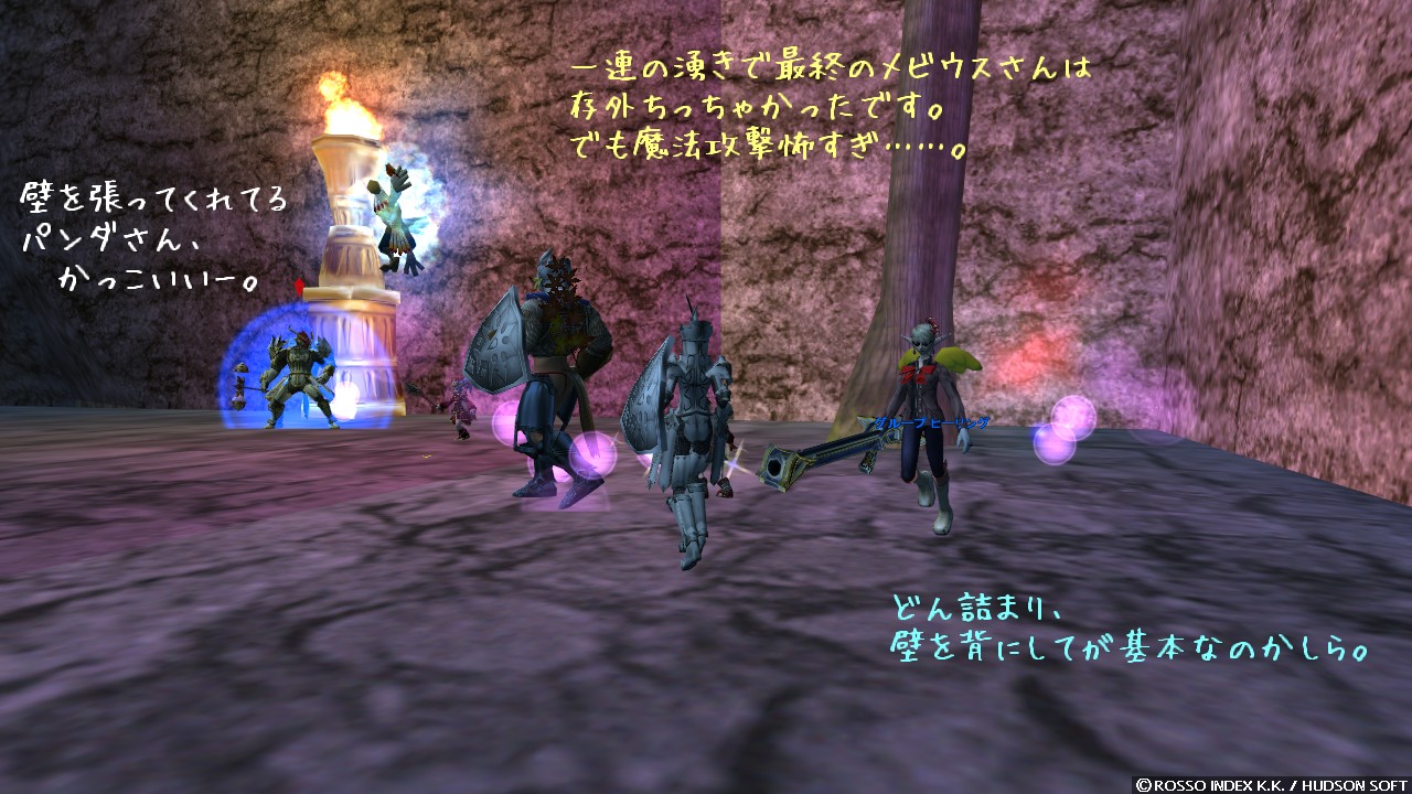適当についてっているうちに、気が付いたらメインディッシュのメビウスさんご登場でした。 よくは知らないんですけど、湧きを順番に倒すコツみたいなのもあるらしいですね。 スムーズに行ってたのは、どうやら釣りが上手だったからのようです。 GJ ですよー。