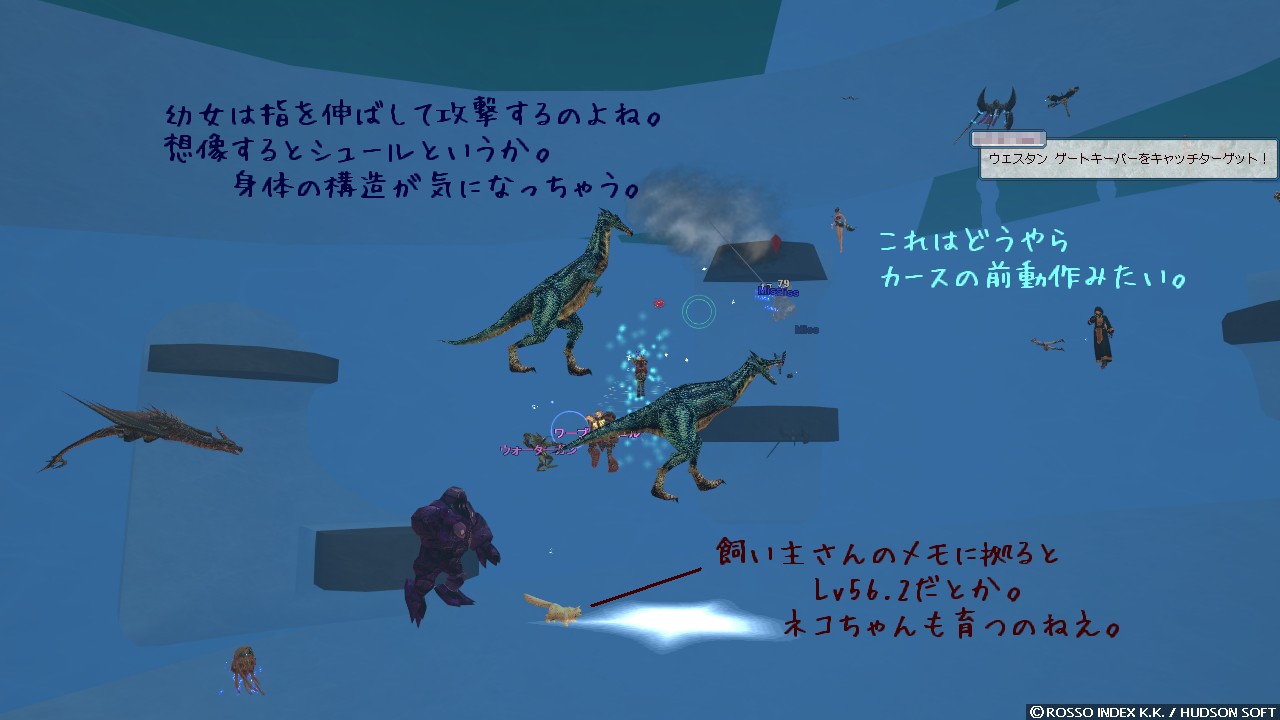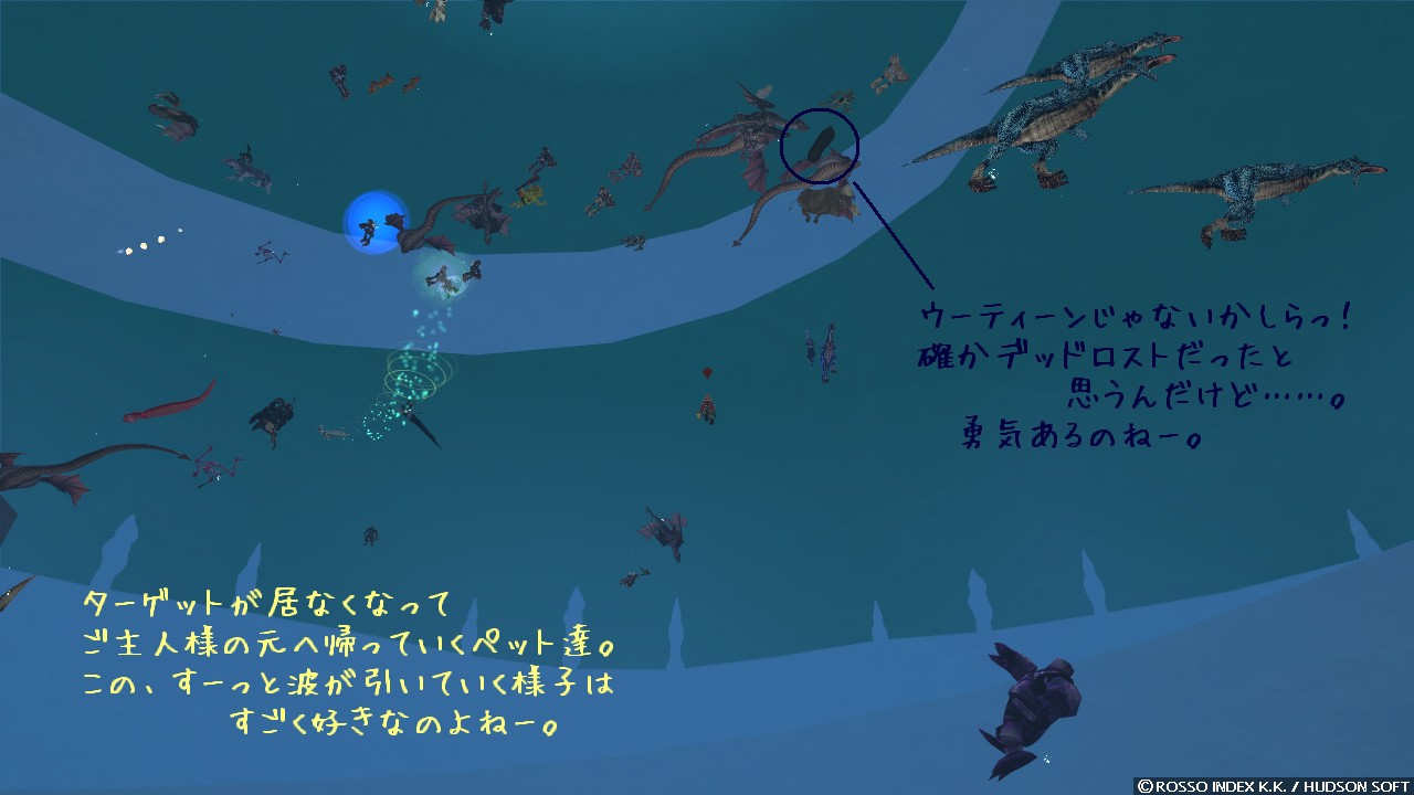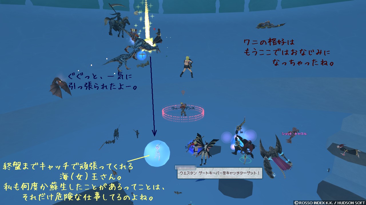 適当に弓銃さんたちが集まってそうな場所で、私はまずはウェーブから。 D の幼女戦はフローズンビーム(多少 WGK は回復しますが、ダメは出てますし、被クリ率上がるためトータルだと十分有益)を撃っているメイジさんが居るので、相乗効果でクリティカルが出やすいんじゃないかなと思います。 どうせ踊るなら、位置を上手に取りたいものですね。 水中は 6 方向あるからなかなか難しいんですけど。