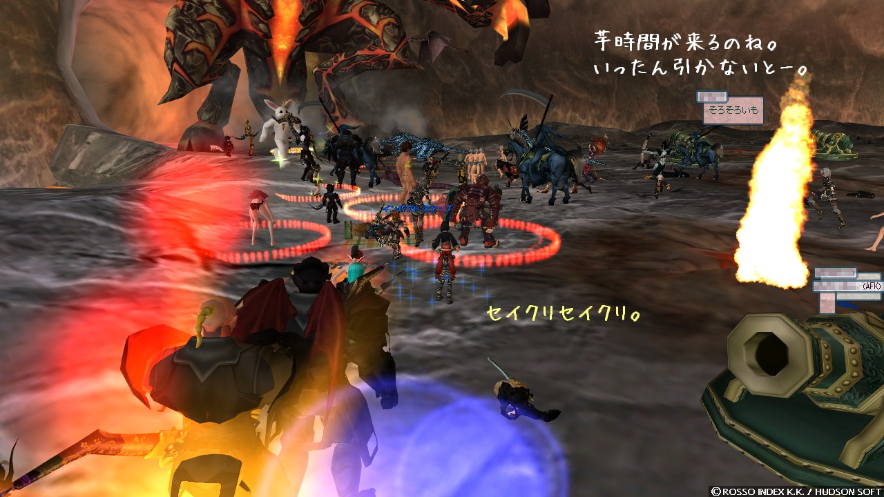 と、下がったところで咆哮に捕まり、効果が切れるまで手持ち無沙汰になりました。 そこでふと横に目をやると、あら大砲を懸命に叩いている芋さんが居ますよ。 インフェルノゴーレムってなんでこんなに可愛いんでしょうね。 ぽこぽこ叩くしぐさに見入りそうになっている私が居ます。 いやいやいやいや。 だめだめ、中身は凶悪なんだから。
