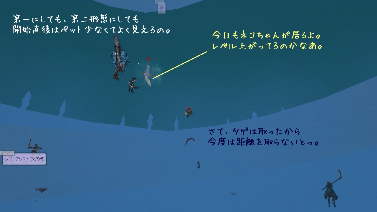 開戦後のウェーブは、折角なのでウチの弓さんの隣で踊ることにします。 拒絶やカースのごとに位置調整は面倒ですけど、それなりに効果が乗せられてると嬉しいですね。 近くに見えるほかの弓さんにも適当にリバを飛ばしているうちに、今日の第一形態は終了です。