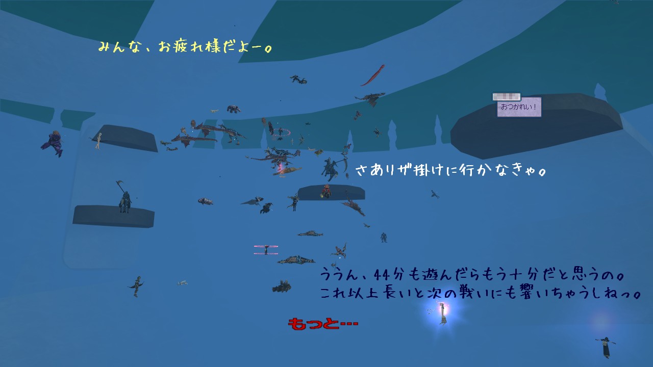 そうそう、今ログを見たら足場に戻る途中に HA をかけてもらっていたようでした。 プレジャー中だからもちろん幼女に吸われてしまっています。 逃げるのに必死すぎて say で P アリ宣言をしておかなかった私が悪いんですが、それはまあ置いておくとして。