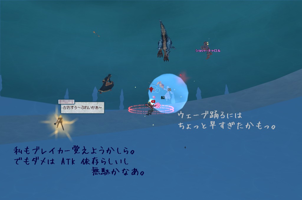 そして果敢に攻めに行っていた彼女にアドバイスを送ろうと PT チャットを打っているときのことなんですが。 え! 今蘇生ガンプでなかった??? 文字修正で ESC キーを押すタイミングに被って、生き返りますか、の窓が出てたようです。 ESC で消えちゃうんですね……。 折角蘇生貰ったのにキャンセルしちゃいましたよ。 しょぼん。