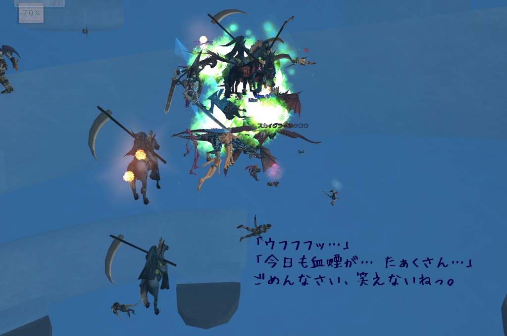 第二形態になった直後、どこを向いても幼女が見えないと思ったら、南足場のすぐ側までお出かけしちゃってました。 足場の先のあたりが戦場になってるから逃げ遅れた人たちの血煙がたくさん立ってますよ。 多分カース以外の攻撃も入っちゃってるんでしょうね。 水泳 0 だと逃げられないんだろうなあ。 ともかく片っ端からリザリザ。