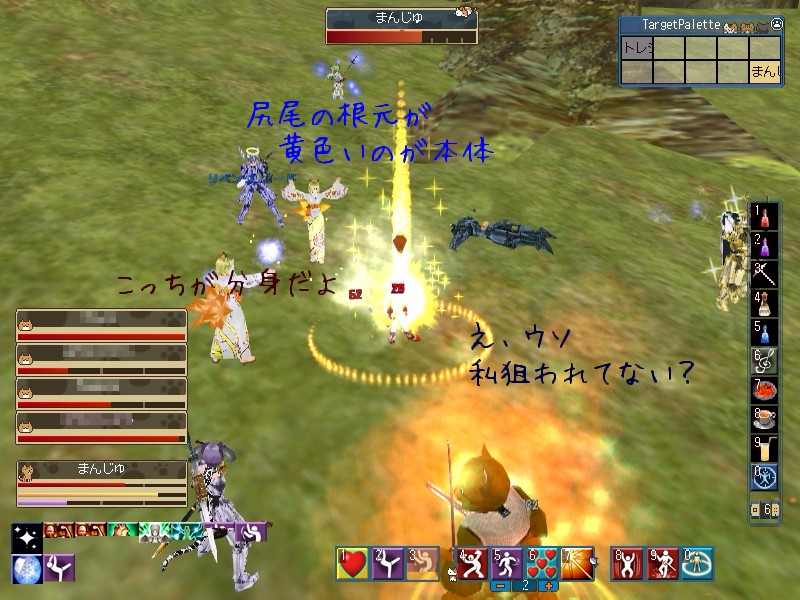 動画を見返してチェックしたところ、本体はしっぽの根元の色が違っていたみたいです。 黄色い方が本物、分身はオレンジがかっていました。 ただ変身されるともう見分けがつかないので、やっぱりタゲパレが有効なのかしら。 死ぬと登録が消えちゃうので死なないことが前提ですが……。 この mob 相手に死なないっていうのはハードルが高いんじゃないでしょうかねー。