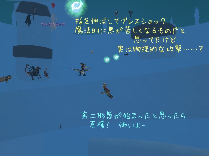第二形態が始まってから最前線の死体にリザを入れた後、違和感を覚えました。 ダメージが入るのは分かるけど、え、これ……打撃音!? 慌てて足場に引き返しながら HA を唱えると、今度は細かい連続ダメで詠唱中断されてるじゃないですかっ。 ひっかき、ってことはフィニュかしら。