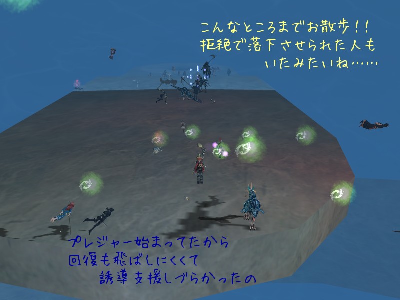 私が足場でヘイトリッドが切れるのを待っていると、なにやら WGK は南足場の方へお出かけしにいったようで……。 攻撃が切れたのを確認して前線まで戻ったときには、もう水球外間近でしたね。 これは危ないです。 足場にいるのは軟い人達ばかりというのもあるんですけど、逃げ場がないのが一番困りますものね。 実際、拒絶で足場から落とされた人も居たようでした。
