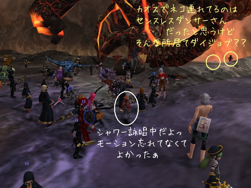 IGK が大きく反り返ったら自己シャワー。 この咆哮のモーションはちゃんと覚えていたようで、できた自分にちょっとほっとしました。 見えたものに関してはちゃんと解除してタウントに繋げてっと。 陣取ってる右側は、見えた限りでセンスレスダンサーさんが 3 人ほどかな、近くに居たのでそこまで頑張らなくても良かったんでしょうけどね。 シャワーで解除だとどうしても一手遅れますし。 でも保険は大事ですもの。 間に合うのならやっておくに越したことはないと思います。
