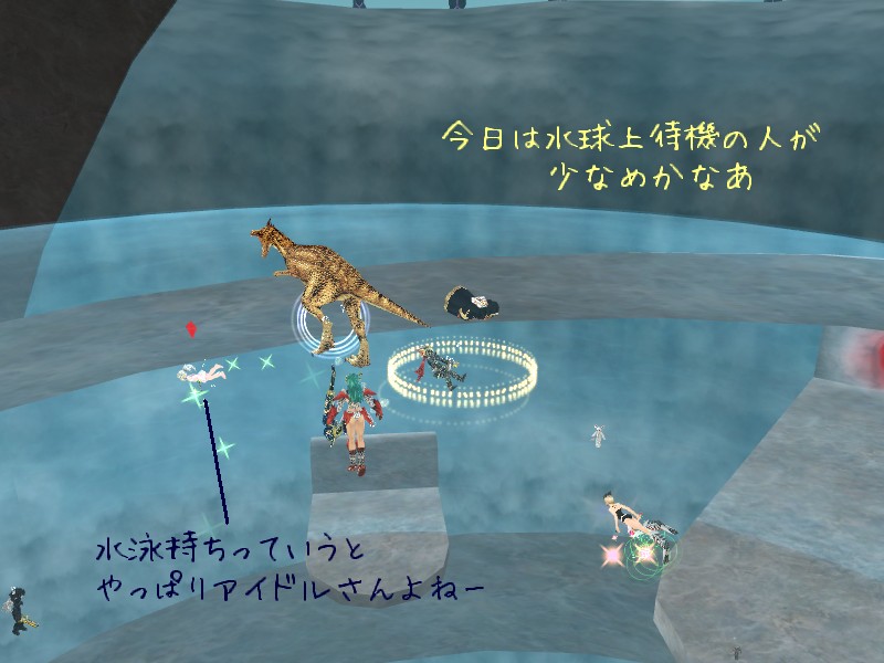 今日は前線の PC が少なめなんでしょうかね。 開始前に水球上に居た人数も少なかったですし、始まってからも視界に入る人が多くないように思います。 削るペースが遅く感じるのはその辺りの影響なんでしょうか。
