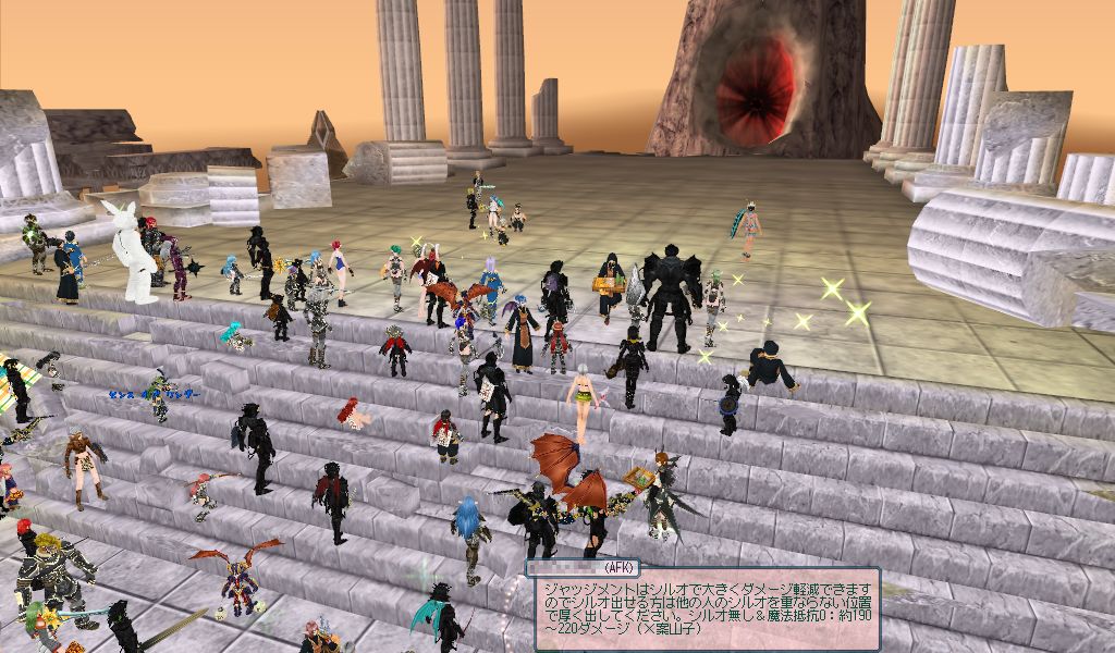 さて今回も近接さんが PT に二人。 どうやら LoC の真正面につけるようなので、私もその真後ろにつきます。 真正面は、LoC がどっちを向いていても攻撃が飛んでくる可能性が高いのでかなりビクビクものなんですけどね、ここは頑張るトコです。 も一人のメンバーさんはいつも通り右翼中後方の様子でした。 そっちはダンスヒール厚かったと思うので多分大丈夫でしょう。