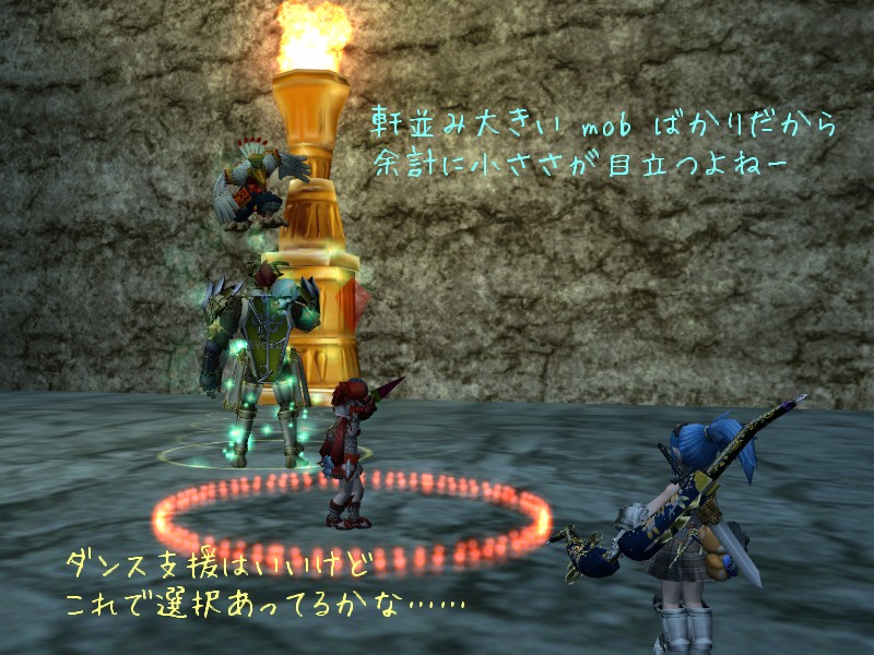 ジャスタン系さんがしっかり盾を張ってくれている隣でダンスダンス。 その後方からは弓さんがダメージを与え、ヒラさんがバックアップに回ってくれています。 構成としてはいい感じなんでしょうね。 ジャスタン系さんが壁役として安定してタゲを取ってくれるので、後ろは随分動きやすかったように思います。