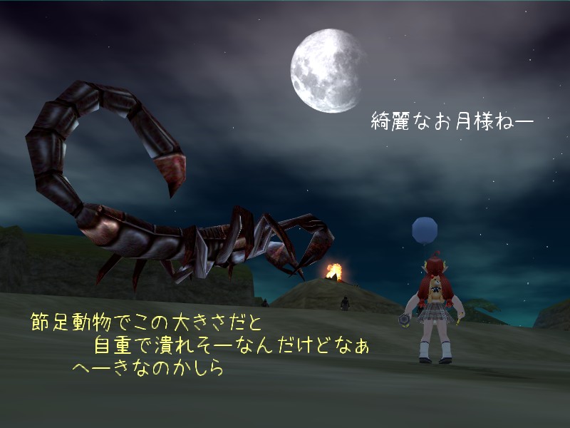 西から正門を抜けて、小蛇からライオン、ワーム。 そして拝火教を目の前にした時、急にサソリ王が湧いたのには驚きました。 慌てて距離を取ってっと。 誰かがやってくるのを待ちましょうか。 SS の構図はちょっと失敗しちゃってますけど、ちょうど月が出ていてなかなかに良い画でしたよ。