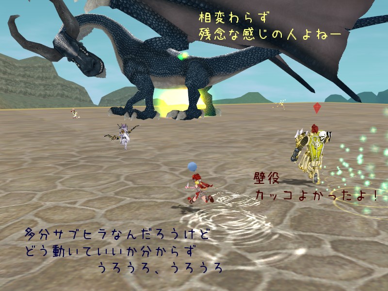 ログインしたところに「どっかいこー」の声がかかったんですよ。 それはごく普通のことだとは思うんですが、言いだしっぺは先日のザブール戦をメビに変えた彼女です。 これは油断できません。 CH 内には 4 人しか居ないのにガイアがどうのって発言が聞こえるんですけど、これは無視を決め込んだ方がいいんでしょうか……?