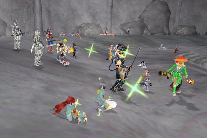 儀式の間に入って沸き待ちの間になんとなく SS を撮ってみたら……。 なんか手前の二人だけ空気が違いますね。 いえ、私とお友達なんですけどねっ。 近所のお祭り気分で参加しちゃってスミマセン。 右手に見えるキノコさんも異色ですけど、こちらはある意味最も MoE らしい格好ですし、なんの不自然さもないのです。