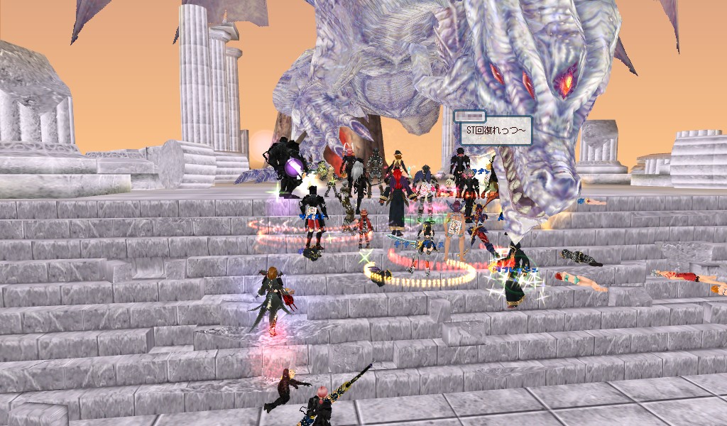 門内は 100 人程度、前線はせいぜい 50 人くらいでしょうか。 ある程度少人数でも勝てる相手ですが、やっぱりこれだけ少ないと不安になりますね。 でもこちらはフル PT だし、前線で顔見知りのダンサーさんにも会えたので心強いです。 弱気にならず頑張りましょうか。