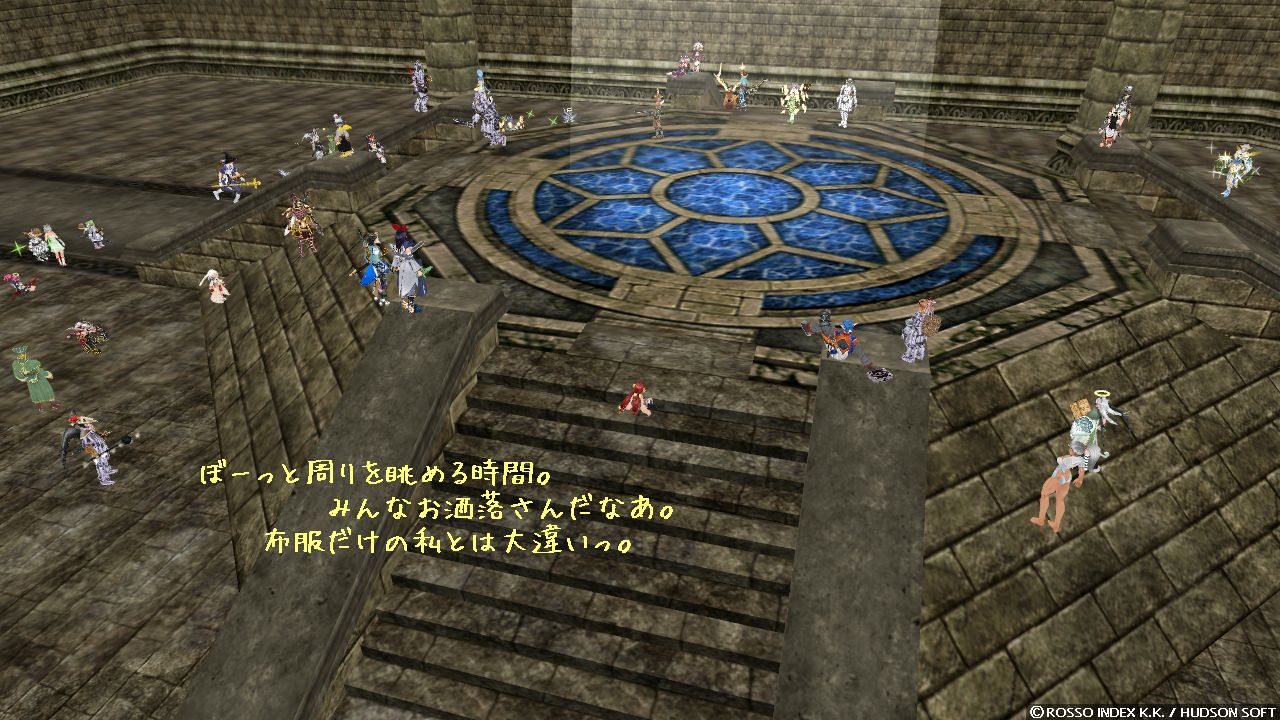 PT 構成は、私が多分ヒーラーなのかな、お友達がジャスタンさん、前述のダンサーさんと盾持ち弓さん、プリロさんは強化持ちでバッファとしても動いてくれてました。 結構バランスいい感じなのかしら。 私が動くのはダンサーとしてかヒーラーとしてか。 どちらか一本のほうが効果的なのは分かってますけど、今日はあえて両方で行ってみます。 参加人数も多いし、少なくとも迷惑は掛からないかなって。