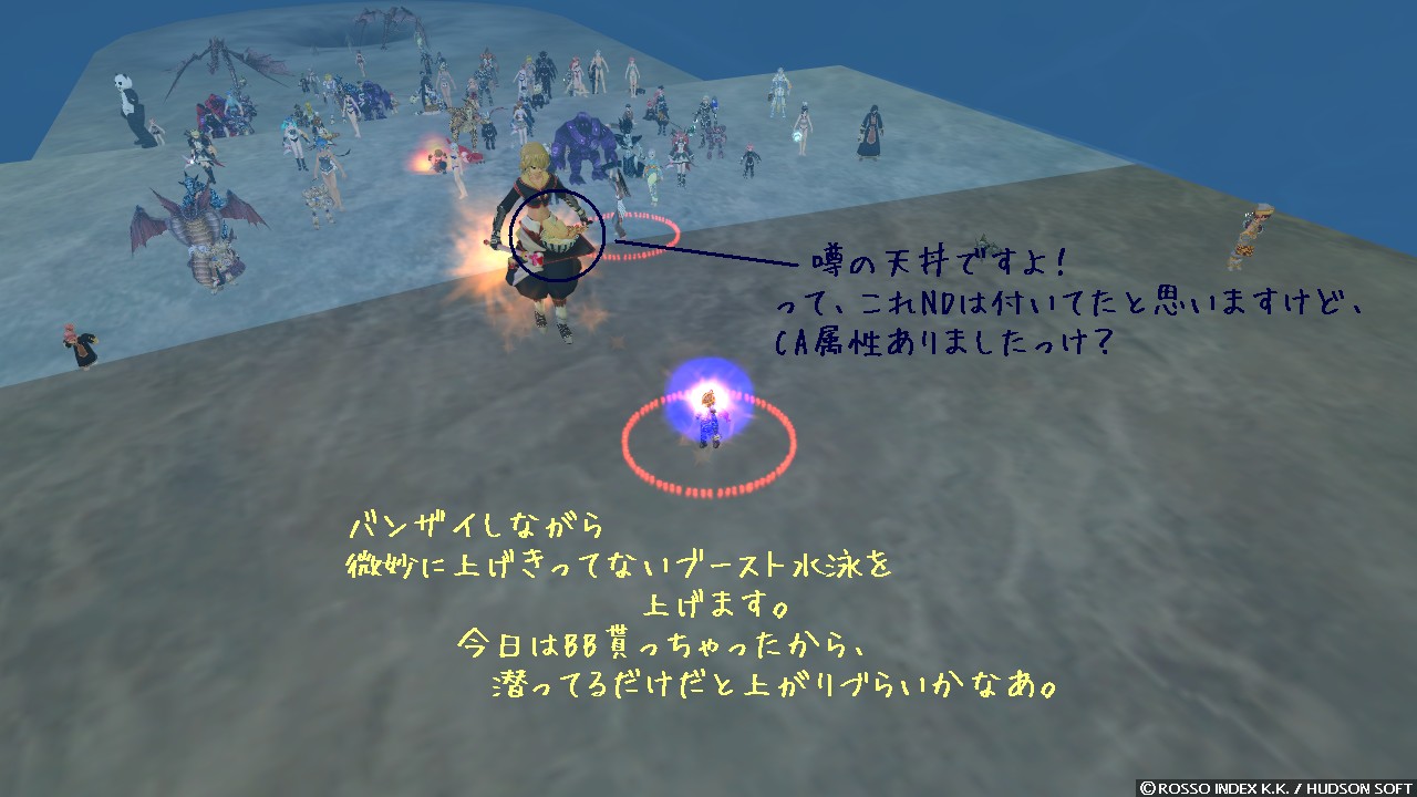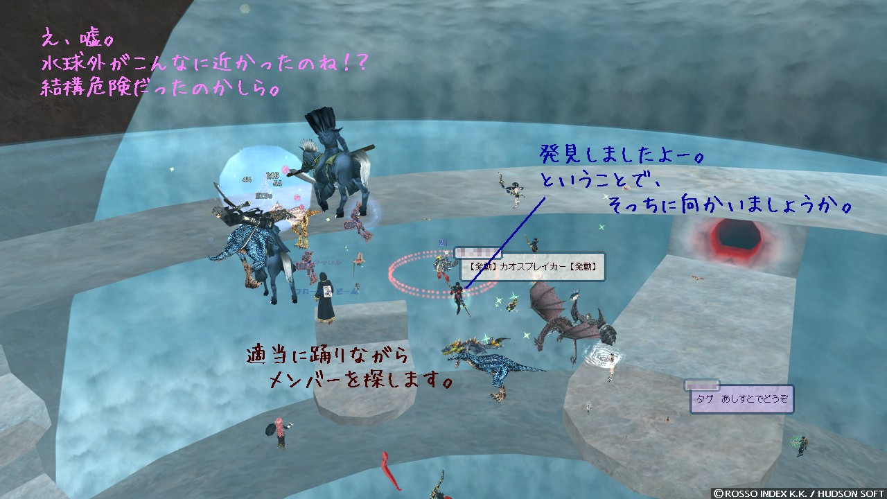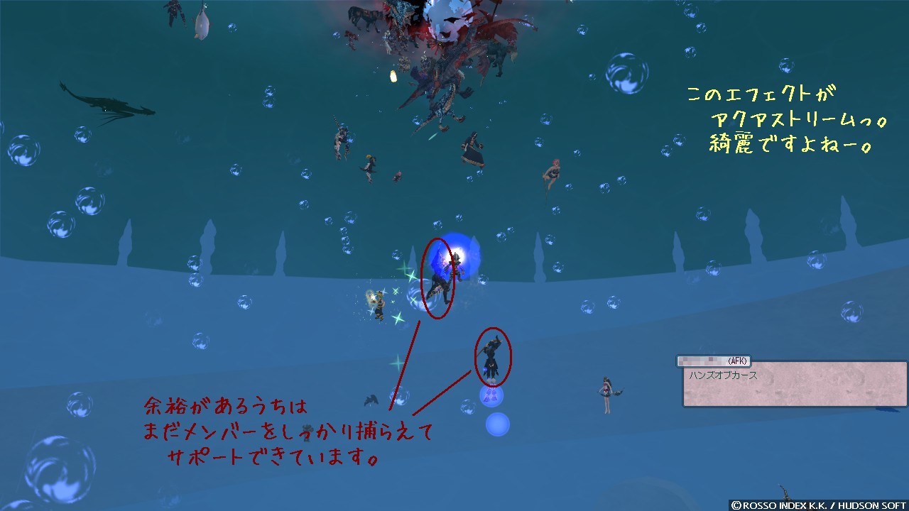 なんて悠長なことを言ってられません。 3 つほど、しかも気持ち重めのですよ。 自己回復繰り返しながら慌てて足場に逃げ出しました。 水球外でビクビクしていましたけど、ここまでは届かないみたいですね。 ほっと一息です。 ちょこっと休憩してから様子を見つつ前線へ復帰、よし、ヘイトリッドは切れたみたいですね。