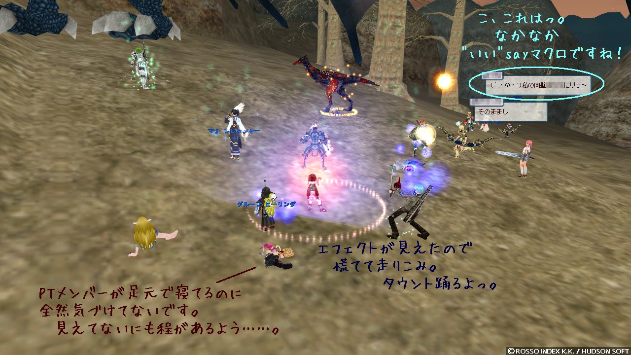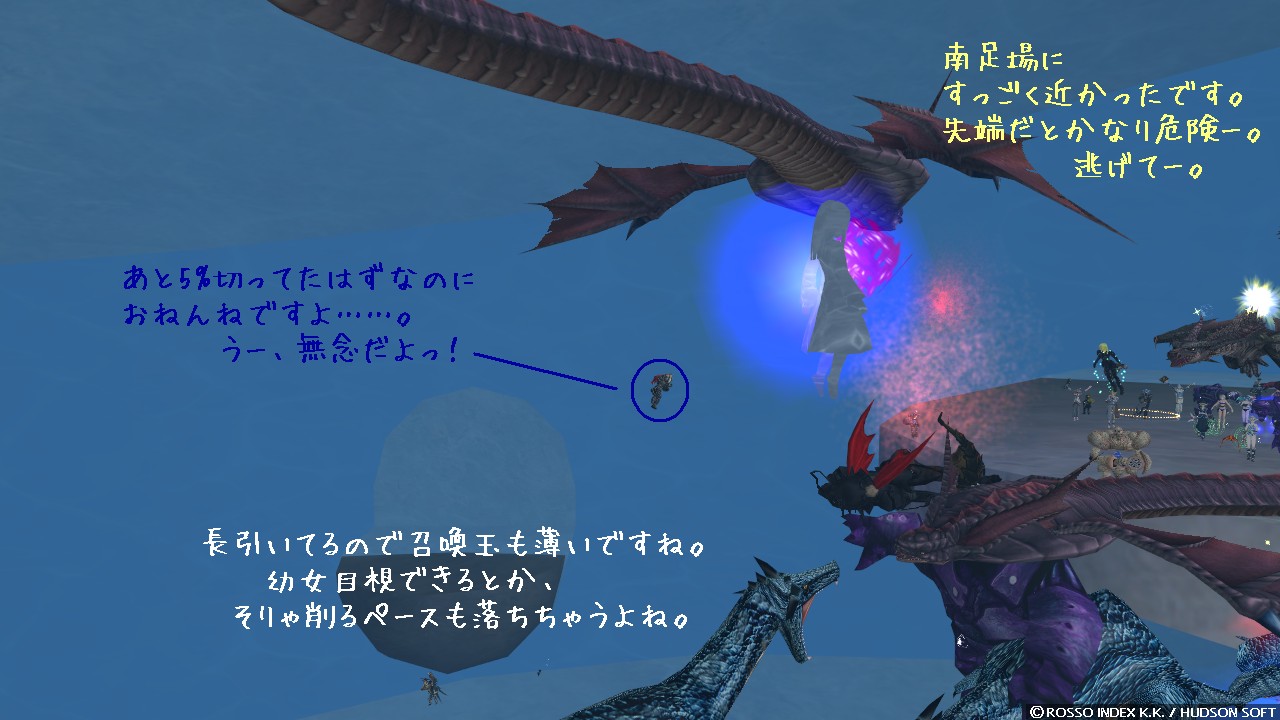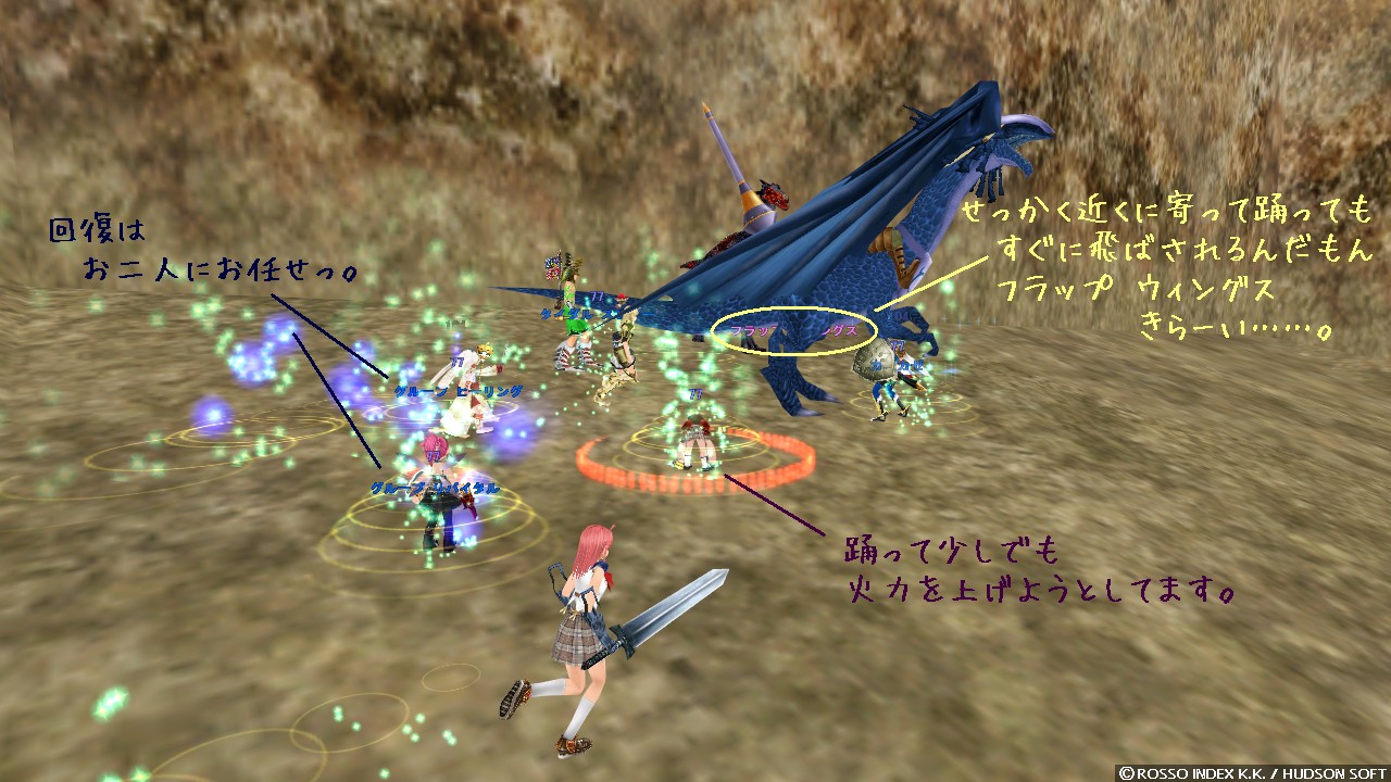 回復しなくちゃいけないのに出来ないから、涙目になりながらマナポと GH 連打ですよ。 必死すぎて気づいていませんでしたけど、会話のログを見ると「踊りなんていいから、さっさと回復してくれ(もちろん脚色してあります!)」って言われてるしー。 うー、ヒラとして入ったはずなのにちょっとした回復も飛ばせなくてゴメンナサイですよ……。 なんかログ見返してて惨めな気分になってきました。 幸いにもメンバーはそこそこ硬く、二回に一回くらいしか飛ばせない回復でもなんとか持ちこたえてくれていましたけどね。