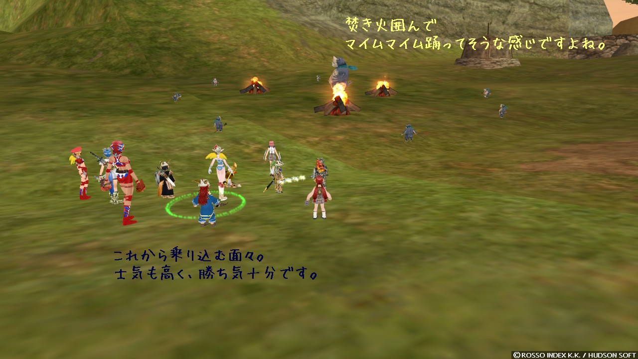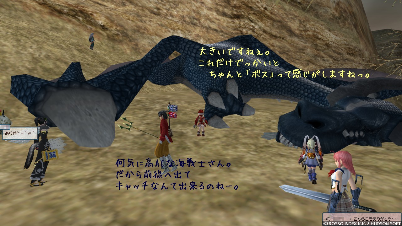 私はいつも適当に回復だとか踊ってるだけなんですけど、この大人数だとホント何もしないうちにクエストが進みま……あれ? 進まない。 ウチの PT が最後まで残っちゃったみたいですよ。 ふと PT 内を見直してみると、ヒラがリーダーさんを含めて 2、あとジャスタン系さんと、海戦士さん、そして私……。 せんせー、本職の前衛が一人しかいませーん。 そりゃルート負けするってモノですよね。